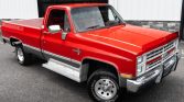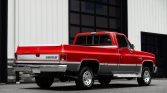 This 1987 Chevrolet V10 Silverado is a 4×4 Fleetside pickup is finished in red and gray over burgundy cloth and is powered by a 5.7-liter V8 linked with a four-speed automatic transmission and a dual-range transfer case. Additional equipment includes 15″ eight-hole wheels, front disc brakes, power steering, a front wind deflector, a sliding rear window, and running boards in addition to air conditioning, a cassette stereo, and power windows and locks.