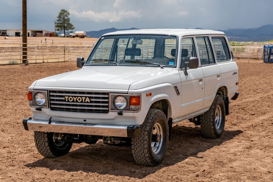 This 1987 Toyota Land Cruiser FJ60 was registered in California and New Mexico before it was acquired by the seller in 2018 and moved to Arizona. The truck is finished in white over brown and is powered by a 4.2-liter inline-six paired with a four-speed manual transmission and a dual-range transfer case. Refurbishment work completed by the seller included rust and paint repairs on the hood and around the windows as well as an engine rebuild and mechanical refresh. Equipment includes an inclinometer, air conditioning, an AM/FM radio, and an Old Man Emu suspension lift that was installed by the seller.