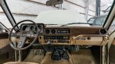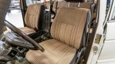 The cabin features front bucket seats and a rear bench upholstered in striped brown cloth and vinyl trim along with brown carpets and a brown and tan dashboard and door panels. Equipment includes a passenger grab bar, a brown carpeted dash cover, air conditioning, manual windows, an inclinometer, and an AM/FM radio. The air conditioning has been converted to R134a refrigerant, and the seller states that the dashboard has a crack near the inclinometer.