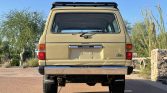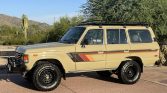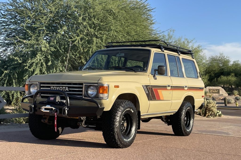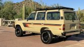 This 1987 Toyota Land Cruiser FJ60 is finished in tan with multicolor graphics over a tan and brown cloth and vinyl interior and is powered by a 4.2-liter inline-six linked with a four-speed manual transmission and a dual-range transfer case. Additional equipment includes an Old Man Emu lift kit, a 4PlusProducts front bumper, a Warn winch, a Land Cruiser Restorations roof rack, a Kenwood head unit, and air conditioning.