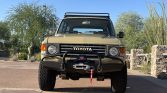 The truck was reportedly refinished in tan with multicolor graphics and features a split rear tailgate. Additional equipment includes a 4PlusProducts front push bumper with an integrated Warn winch and D-shackles, a Toyota chrome rear bumper and end caps, and a Land Cruiser Restorations roof rack. The Carfax report notes an accident in March 2002.