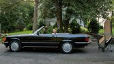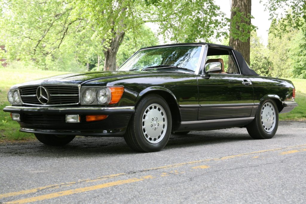 This 1988 Mercedes-Benz 560SL is finished in black over Palomino leather and is powered by a 5.5-liter V8 paired with a four-speed automatic transmission. Equipment includes a body-colored removable hardtop, a black soft top, 15″ Gullideckel alloy wheels, Euro-style bumpers, fog lights, automatic climate control, cruise control, and a Pioneer CD stereo