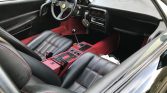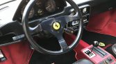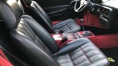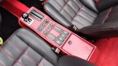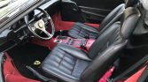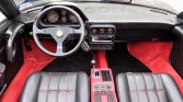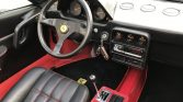 The interior features seats that have been reupholstered in black leather with red stitching along with a matching dashboard, door panels, and red carpeting. Amenities include air conditioning, power windows, Ferrari-branded floor mats, a gated shifter, and an Alpine stereo. The seller notes that the speakers have been removed and the air conditioning is inoperable.