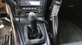 The cabin features manually-adjustable black leather (LA22) sport seats with matching carpets and door panels. A period Motorola car phone was installed under previous ownership, and additional amenities include power windows and locks, air conditioning, cruise control, and a factory CD/cassette stereo.