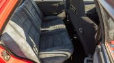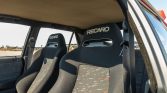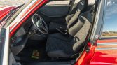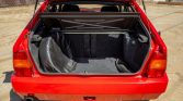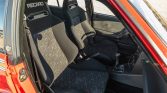 The Evolution I features an adjustable rear spoiler and boxed fender flares to accommodate the extended track width. This example is finished in Rosso Monza (159) and features red and blue Martini Racing-inspired stripes on the sides and hatch, along with a front chin guard and Evo 2-style grills. The seller reports that the hood was repainted prior to the car’s importation, and areas of corrosion around the roof and a window were repaired.