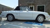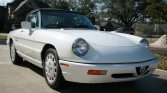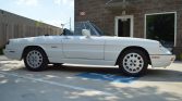 This 1993 Alfa Romeo Spider Veloce was delivered new at Lochmoor Chrysler-Plymouth-Alfa Romeo of Detroit, Michigan, and was reportedly acquired by the seller from its first owner in 2011. The car is finished in white over black leather and is powered by a 2.0-liter inline-four paired with a five-speed manual transmission. Equipment includes a black soft top with a matching boot, air conditioning, 15″ alloy wheels, a cassette stereo, and power windows.