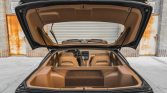 The cockpit features tan leather upholstery on the seats and armrests as well as a matching dashboard, carpets, and floor mats. Other equipment includes a power-adjustable driver seat, automatic climate control, cruise control, and an aftermarket Pioneer infotainment screen paired with a Bose audio system. Carbon-look center console trim has been added along with a short-throw shifter kit, and an HKS boost controller has been fitted in the glovebox.