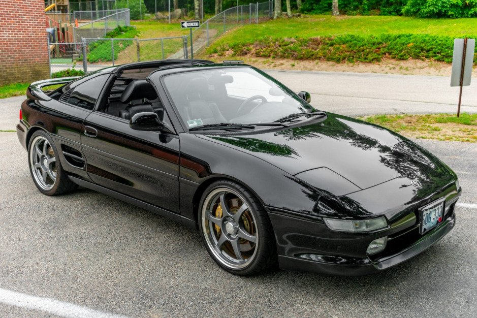 This 1993 Toyota MR2 is finished in black over black leather, and it was purchased by the seller in 2005 and subsequently modified with 18″ SSR wheels, four-piston front brake calipers, suspension upgrades, and a custom stereo system with touchscreen head unit. The 2.0-liter 3S-GTE inline-four is paired with a five-speed manual transaxle and was rebuilt with a Garrett GT3071R turbocharger, an AEM engine management system, an intercooler fan, and a custom-fabricated turbo-back exhaust system. Factory equipment includes removable T-top roof panels, air conditioning, cruise control, and power windows.