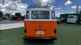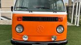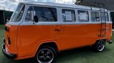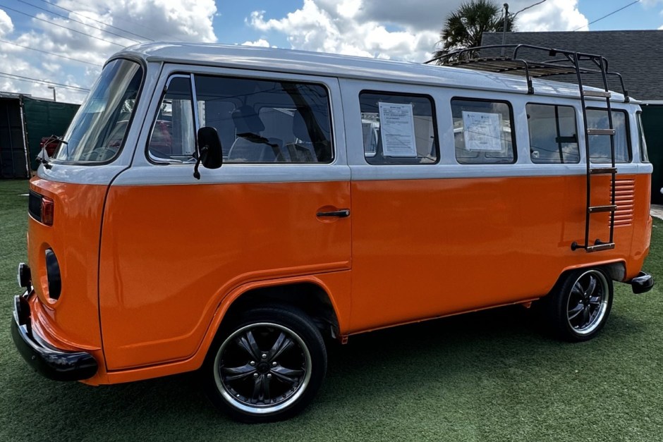 This 1994 Volkswagen Kombi was refurbished in Brazil before being imported to the US in March 2023. It is finished in white with orange vinyl wrapping on the lower half over black patterned upholstery and powered by an air-cooled 1.6L flat-four paired with a four-speed manual transaxle. Equipment includes 17″ aftermarket wheels, rack-and-pinion power steering, front disc brakes, right-side barn doors, a roof rack, three rows of bench seating, and an aftermarket head unit.