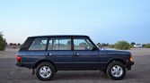 The truck is finished in Plymouth Blue Metallic and features black roof pillars, a receiver hitch, chrome-aLented bumpers, fog lights, and gold “Range Rover” lettering on the hood. The heated windshield and exterior windshield trim were reportedly replaced under current ownership.