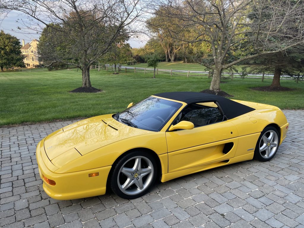 This 1997 Ferrari F355 Spider is finished in Giallo Modena over black leather and is powered by a 3.5-liter DOHC V8 paired with a gated six-speed manual transaxle and a limited-slip differential. Features include a black convertible soft top, a Tubi muffler, a Kenwood stereo, automatic climate control, power windows, Gothspeed heat shields, pop-up headlamps, fog lights, and 18″ five-spoke wheels.