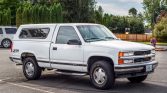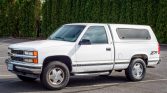 This 1998 Chevrolet K1500 Silverado 4×4 pickup now shows 56k miles with time spent in both Oregon and Hawaii. It is finished in Summit White over gray cloth and is powered by a 5.7-liter V8 linked with a four-speed automatic transmission and a dual-range transfer case. Features include an Airaid air-intake system, a Flowmaster exhaust system, a camper bed top, a receiver hitch, 16″ five-spoke alloy wheels, a power-adjustable split bench seat, an AM/FM stereo, a CD receiver,…