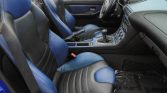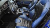 The cabin features power-adjustable and heated seats upholstered in blue and black Nappa leather along with a matching dashboard, door panels, and steering wheel. Equipment includes dual roll hoops, air conditioning, cruise control, and Harman Kardon audio with a BMW Business CD head unit. The left-side seatbelt guide and headlight switch trim cap are missing, and there is a crack in the center console trim around the air conditioning button.