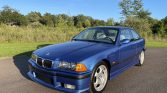 The previous owner has refinished this 1999 BMW M3 coupe in Estoril Blue Metallic, retrimmed the headliner in Alcantara, refreshed the cooling system, and replaced the valve cover gaskets, ignition components, and the tires. The car is powered by a 3.2-liter inline-six paired with a five-speed manual transmission. The interior is trimmed in Light Gray Nappa leather, and additional features include a limited-slip differential, a sunroof, 17″ Style 23 wheels, heated power-adjustable Vader sport seats, a remote six-disc CD changer, a Harman Kardon sound system, and dual-zone automatic climate control.