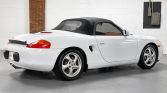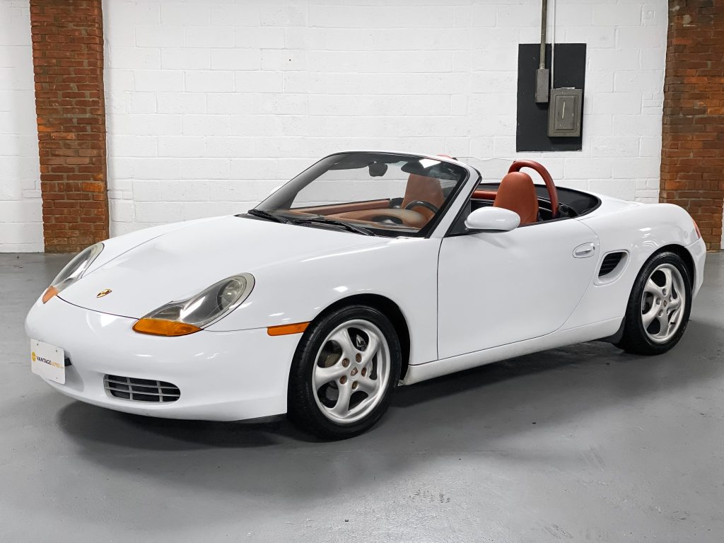 This 1999 Porsche Boxster is finished in Glacier White over Boxster Red leather and is powered by a 2.5-liter flat-six paired with a five-speed manual transaxle. Equipment includes a black soft top, 17″ cast alloy wheels, a deployable rear spoiler, automatic climate control, cruise control, and an aftermarket Alpine head unit.