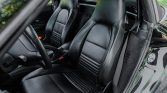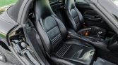 The cabin features seating surfaces upholstered in black leather with matching trim and carpets, the latter of which are protected by clear plastic floor mats. Amenities include automatic climate control, power-adjustable and heated seats, cruise control, and a factory CD stereo. The seller notes that the sliding door to the luggage compartment behind the seats sticks and requires extra force to operate. A set of Porsche-branded carpeted floor mats are included in the sale.