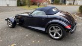 This 2001 Chrysler Prowler Mulholland Edition is finished in Prowler Midnight Blue with light blue pinstriping and a color-coordinated soft top, and it is powered by a 3.5-liter V6 paired with a four-speed automatic transaxle. Equipment includes staggered-diameter chrome-finished alloy wheels, air conditioning, cruise control, and an audio system with a six-disc CD changer and a cassette player.