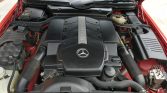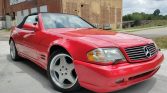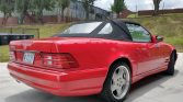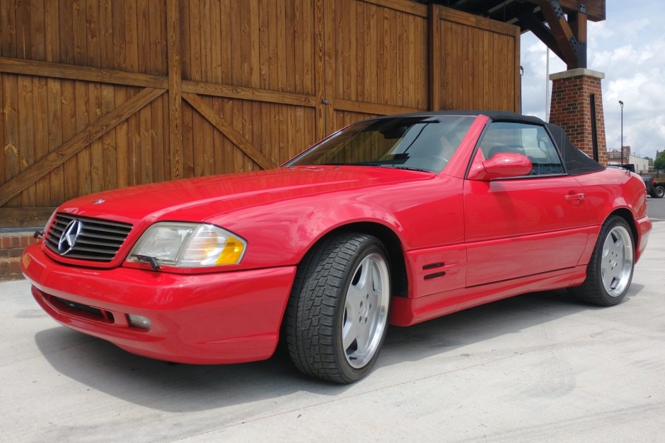 This 2001 Mercedes-Benz SL500 is powered by a 5.0-liter V8 paired with a five-speed automatic transmission and is finished in Magma Red over black Nappa leather upholstery. Features include a removable hardtop, a black soft top, 18″ five-spoke AMG wheels, fog lights, heated power-adjustable seats, a Bose sound system, a remote six-disc CD changer, and automatic climate control.
