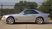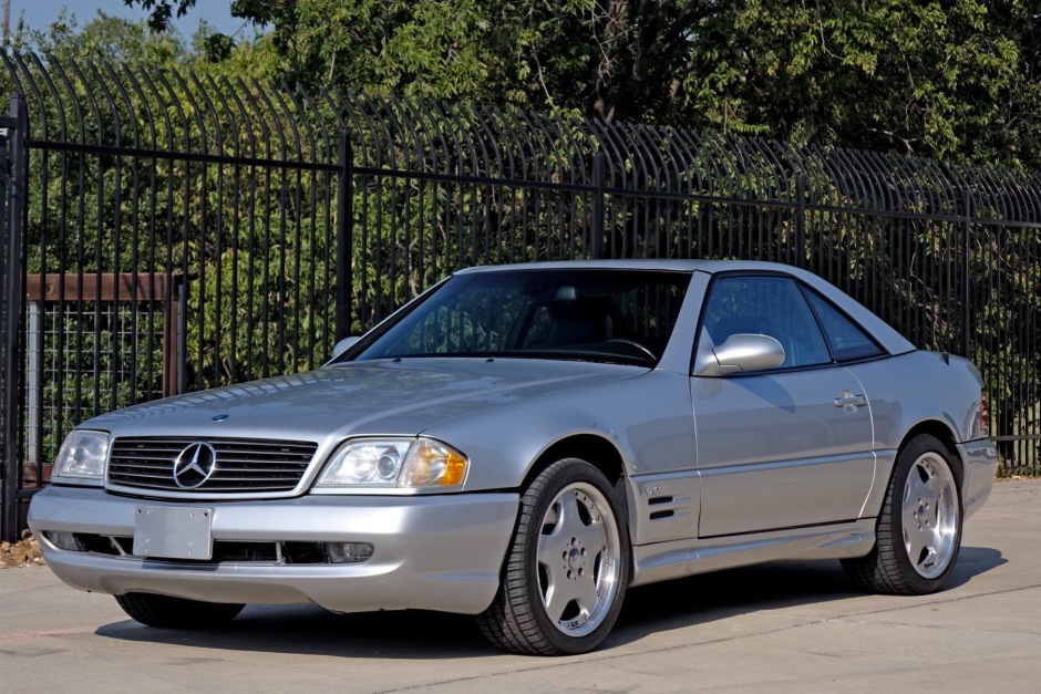 This 2001 Mercedes-Benz SL600 was originally delivered to Younger Motor Cars of Hagerstown, Maryland, and is finished in Brilliant Silver Metallic over black leather. Power is supplied by a 6.0-liter V12 paired with a five-speed automatic transmission, and equipment includes a removable hardtop, a black soft top, an Electronic Stability Program, an AMG styling package, a roll bar, automatic climate control, heated seats, xenon headlamps, fog lights, and 18″ AMG wheels.
