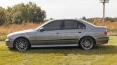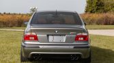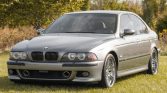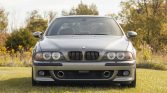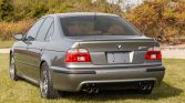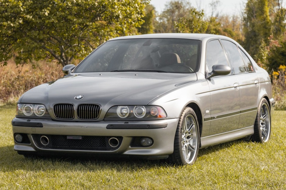 This 2002 BMW M5 is finished in Sterling Gray Metallic over Caramel Nappa Heritage leather upholstery and is powered by a 4.9-liter DOHC V8 paired with a six-speed manual transmission and a limited-slip differential. Equipment includes xenon headlights, 18″ Style 65 wheels, heated and power-adjustable front seats, a moonroof, automatic climate control, and Park Distance Control, while modifications include a Slimmbones rear diffuser, a built-in K40 radar detector, and engine management software from Evolve Tuning.