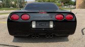 The car is finished in black and differs from the standard Corvette with weight-saving glass, reduced sound dampening material, and a fixed roof for increased chassis stiffness. Features include pop-up headlamps, Z06 fender badges, rear brake vents, and quad exhaust outlets.