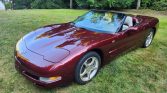 The car is finished in 50th Anniversary Red Metallic and features a Shale convertible soft top as well as pop-up headlights, fog lights, body side moldings, a Corvette-branded front plate cover, and quad exhaust outlets.