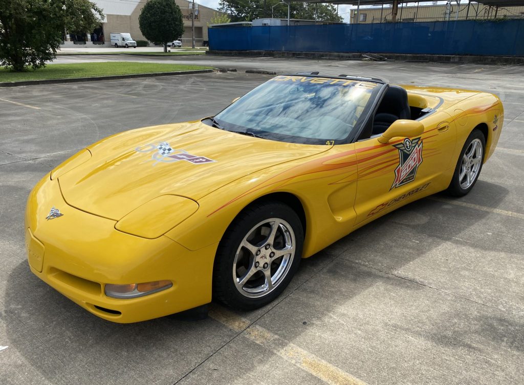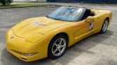 This 2003 Chevrolet Corvette convertible was used in the 500 Festival for the 2003 Indianapolis 500. The car is finished in Millenium Yellow over black leather and is powered by a 5.7-liter V8 paired with a four-speed automatic transaxle and a limited-slip differential. Features include a black soft top, the 1SB Preferred Equipment Group, 17″ and 18″ polished aluminum wheels, dual-zone automatic climate control, power-adjustable seats, and an AM/FM/cassette stereo paired with a 12-disc CD changer and…