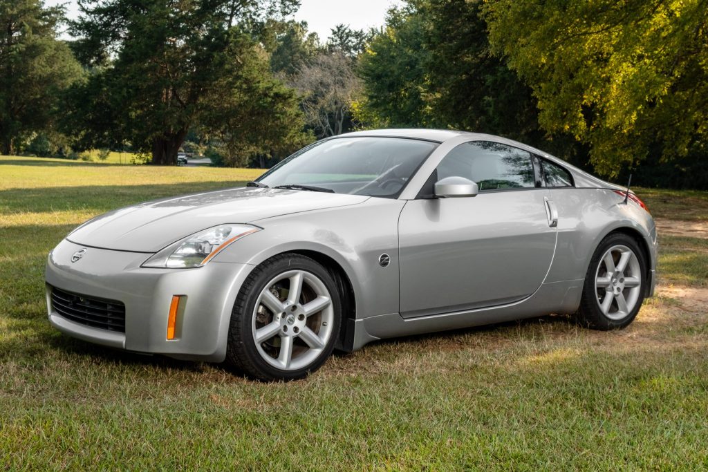 This 2003 Nissan 350Z Touring coupe was delivered new to Hubert Vester Nissan in Clinton, North Carolina, and was acquired by the seller in July 2020. It is finished in silver over gray leather upholstery and is powered by a 3.5-liter V6 paired with a six-speed manual transmission and a limited-slip differential. Features include automatic climate control, xenon headlamps, power-operated and heated seats, and a Bose cassette stereo and six-disc CD changer. The tires were reportedly replaced under current ownership.