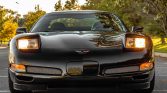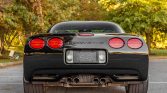 The car is finished in black and features a fixed hardtop, pop-up headlights, mesh front grille inserts, body side moldings, and an electrochromatic left-side mirror. Z06-specific equipment includes functional brake-cooling ducts, thinner glass, reduced sound deadening material, and titanium quad exhaust outlets.