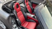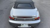 The car is finished in Silverstone Metallic and features a power-operated soft top with a glass rear window, xenon headlights, clear side markers, tinted windows, a rear spoiler, and dual exhaust outlets.