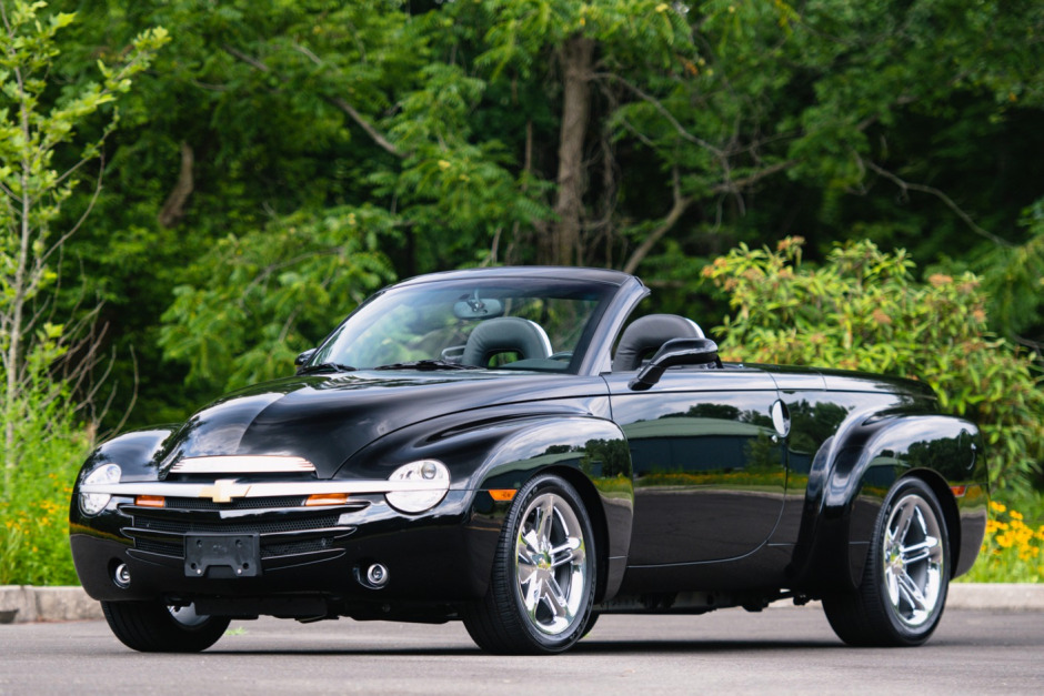 This 2005 Chevrolet SSR is finished in black over black leather and powered by a 6.0-liter LS2 V8 mated to a six-speed manual transmission and a limited-slip differential. Features include a retractable roof, a hard tonneau cover, heated and power-adjustable seats, a Belltech lowering kit, chrome-finished wheels, wood bed trim, a Bose audio system, and the optional 1SB Premium Equipment Group. The truck was first registered in Wisconsin and spent time in Illinois, Ohio, and Michigan before being acquired by the current owner in March of 2021.