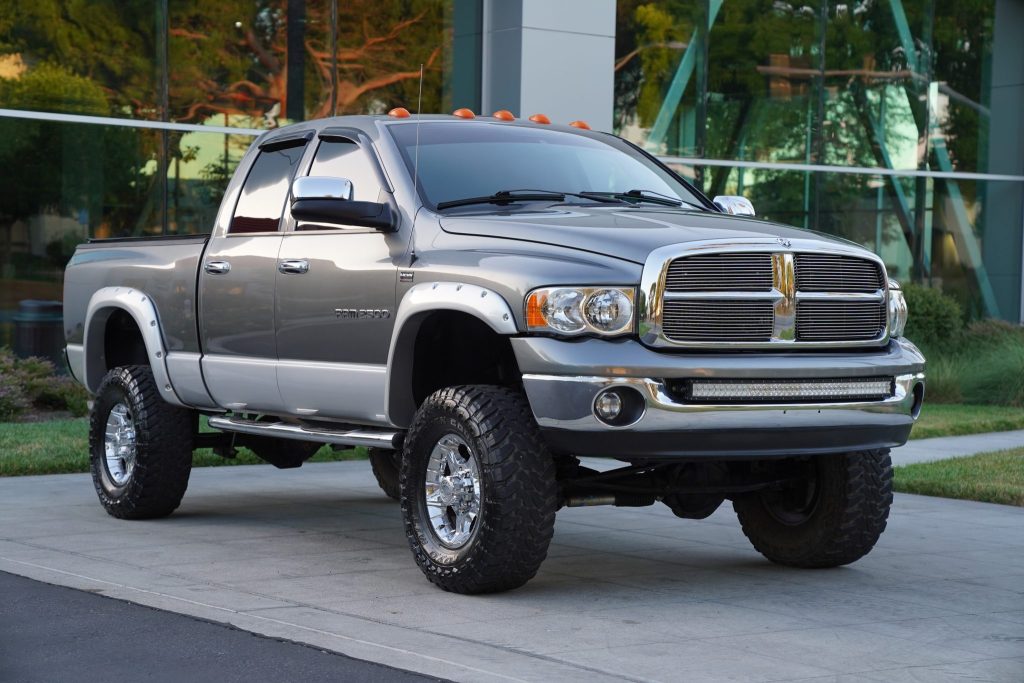 This 2005 Dodge Ram 2500 SLT 4×4 Hemi Sport is a quad cab pickup finished in Mineral Gray Metallic over Dark Slate Gray cloth upholstery and has 54k miles. The truck is powered by a 5.7-liter V8 linked with a five-speed automatic transmission and a dual-range transfer case and has been modified with a front light bar, aftermarket flared wheel arches, 17″ five-spoke Ultra Motorsports wheels, a Tuff Country lift kit, Bilstein dampers, a JVC head unit, a back-up camera, a Hayes trailer brake controller, an aftermarket horn, and a GT Bully Dog fuel tuner. Additional equipment includes the Trailer Tow Group, the Light Group, a receiver hitch, fog lights, tubular side steps, a folding tonneau cover, a power-adjustable driver’s seat, an Infinity sound system, and air conditioning.