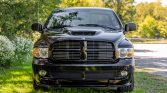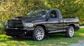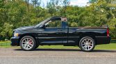 This 2005 Dodge Ram SRT-10 is a regular-cab example powered by an 8.3-liter V10 paired with a six-speed manual transmission and a limited-slip differential and finished in black with a Dark Slate Gray interior. Equipment includes 22″ polished aluminum wheels, performance-tuned suspension, fog lamps, a rear spoiler, a Hurst shifter, dual-zone climate control, an Infinity sound system, and a CD stereo with UConnect and navigation.