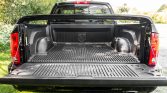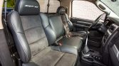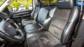 The SRT-10 features a power-bulge hood with a scoop as well as a revised front air dam and side skirts compared to the standard Ram. This example is finished in black and features a body-color rear wing, a sliding rear window, a Ram-branded drop-in bedliner, heated side mirrors, and twin polished exhaust finishers.