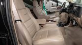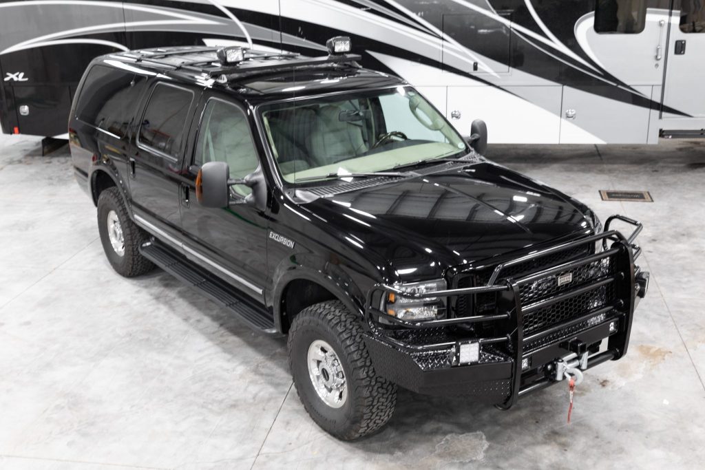 This 2005 Ford Excursion Limited is finished in black over beige leather, and it is powered by a 6.0-liter turbodiesel V8 paired with a five-speed automatic transmission and a dual-range transfer case. Equipment includes 16″ alloy wheels, automatic climate control, cruise control, heated and power-adjustable front seats, separate rear-area climate controls, and a rear entertainment screen with a DVD player. Modifications include a brush guard, a fabricated steel front bumper, a Warn winch, LED driving lights, and a…