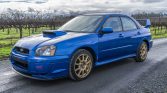 This 2005 Subaru Impreza WRX STi was purchased new by its current owner at Downtown Subaru of Oakland, California, and it now has 50k miles. The car is finished in World Rally Blue Pearl over two-tone cloth and powered by a turbocharged 2.5-liter flat-four that drives all four wheels through a six-speed manual transaxle. Equipment includes a Driver-Controlled Center Differential, front and rear limited-slip differentials, Brembo brake calipers, gold-painted and forged 17″ BBS wheels, a rear wing,…