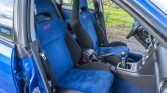 The car is finished in World Rally Blue Pearl and features a front splitter, an aluminum hood with a functional scoop, fog light covers, side skirts, and a rear wing.