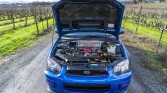 The turbocharged 2.5-liter EJ257 flat-four was rated at 300 horsepower and 300 lb-ft of torque when new. Power is sent to all four wheels through a six-speed manual transaxle, a Driver-Controlled Center Differential, and limited-slip front and rear differentials. The car most recently passed a California emissions test in December 2021.