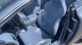 The cabin features power-adjustable front seats upholstered in blue leather with matching door panels and carpeting. Wood trim accents the dashboard, and equipment includes cruise control, automatic climate control, navigation, and a factory CD stereo with satellite radio.