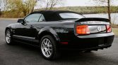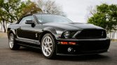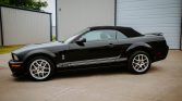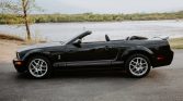 This 2007 Ford Mustang Shelby GT500 convertible shows 900 miles and is powered by a supercharged 5.4-liter V8 paired with a six-speed manual transmission. Finished in black over matching leather, it is equipped with a black soft top, air conditioning, 18″ SVT wheels, SVT-tuned suspension, front and rear spoilers, and a Shaker 1000 audio system.