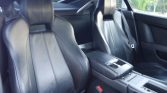 The leather-covered dashboard features a pop-up infotainment screen and houses a CD stereo. Paddle shifters are mounted behind a leather-wrapped steering wheel, and instrumentation consists of a 220-mph speedometer and a reverse-sweep tachometer. The digital odometer shows 20k miles.