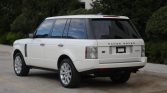 The cabin features seats upholstered in Ivory Oxford leather (TDC) with perforated seat inserts contrasted by a black dash and carpets protected by Range Rover-branded all-weather floor mats. Black woodgrain trim accents the steering wheel, dashboard, center console, and door panels. Additional equipment includes 14-way power-adjustable heated and ventilated front seats with memory, tri-zone automatic climate control, a rear-view camera, cruise control, navigation, Harman Kardon audio with a six-CD changer, Bluetooth connectivity, and satellite radio tuner. A rear-seat entertainment system that includes a six-DVD changer and two LCD screens mounted in the front headrests was added as a factory option.