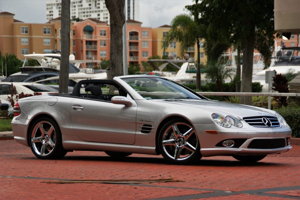 This 2008 Mercedes-Benz SL55 AMG is finished in silver over black leather and is powered by a supercharged 5.4-liter V8 paired with a five-speed automatic transmission. Equipment includes a retractable Panorama Roof, 19″ chrome-clad AMG wheels, bi-xenon headlights, climate-controlled multi-contour seats, Parktronic, carbon-fiber trim, Keyless Go, and an electronic trunk closer. The car was first delivered to Schumacher European Ltd of Phoenix, Arizona, and spent time in Texas and Indiana before its recent acquisition by the selling dealer. This SL55 AMG has 26k miles and is now offered in Florida with a window sticker, a VMI report, manufacturer’s literature, two key fobs, a clean Carfax report, and a clean Indiana title.