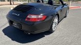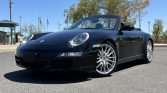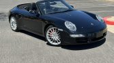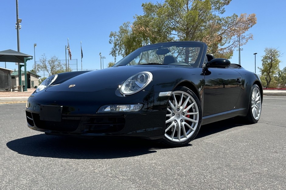 This 2008 Porsche 911 Carrera S is a black-over-black cabriolet powered by a 3.8-liter flat-six paired with a five-speed Tiptronic S automatic transaxle. Equipment includes a black soft top, 19″ Sport Design wheels, a deployable rear spoiler, heated power-adjustable front seats, a Bose sound system, self-dimming mirrors, automatic climate control, and cruise control.