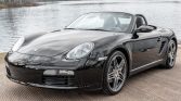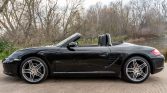 This 2008 Porsche Boxster is powered by a 2.7-liter flat-six paired with a five-speed manual transaxle and is finished in black over matching leather upholstery. Equipment includes a black soft top, 19″ Turbo wheels, a deployable rear spoiler, bi-xenon headlights, heated seats, a Bose sound system, and automatic climate control.