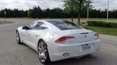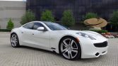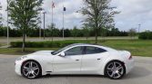 Factory staggered-width 22″ Circuit Blade aluminum wheels are wrapped in Goodyear Eagle F1 tires sized 255/35 up front and 285/35 in back. The car is equipped with Fisker-branded Brembo disc brakes.