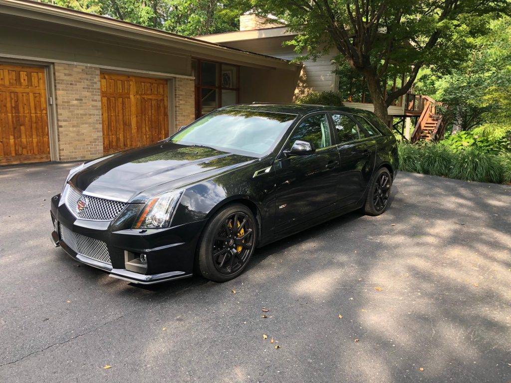 This 2013 Cadillac CTS-V is a Black Diamond Tricoat wagon that was purchased new by the seller at Suburban Cadillac of Plymouth, Michigan, and it now has 31k miles. It is powered by a supercharged 6.2-liter V8 mated to a six-speed manual transmission and a limited-slip differential, and equipment includes Magnetic Ride Control suspension, a panoramic sunroof, a power liftgate, an Escort radar detector, navigation, rear parking sensors, optional satin graphite-finished 19″ wheels, Midnight Sapele wood trim,…
