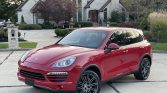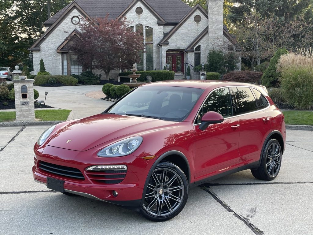 This 2013 Porsche Cayenne is finished in Carmine Red over black leather and is powered by a 3.6-liter V6 driving all four wheels through a six-speed manual transmission. Equipment includes 21″ wheels, parking sensors, stainless steel skid plates, power-adjustable front seats, a heated carbon fiber-trimmed steering wheel, cruise control, dual-zone automatic climate control, and a 10-speaker audio system.