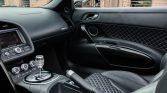 This 2014 Audi R8 Spyder is powered by a 5.2-liter FSI V10 that drives all four wheels through a six-speed manual transaxle and is finished in Phantom Black Pearl Effect over black Fine Nappa leather with diamond stitching. Servicing involved replacing the clutch, flywheel, slave cylinder, and battery. Equipment includes a black convertible soft top, 19″ double-spoke wheels, a speed-activated rear spoiler, LED headlights, parking sensors, a rearview camera, a Bang & Olufsen sound system, and heated power-adjustable seats.