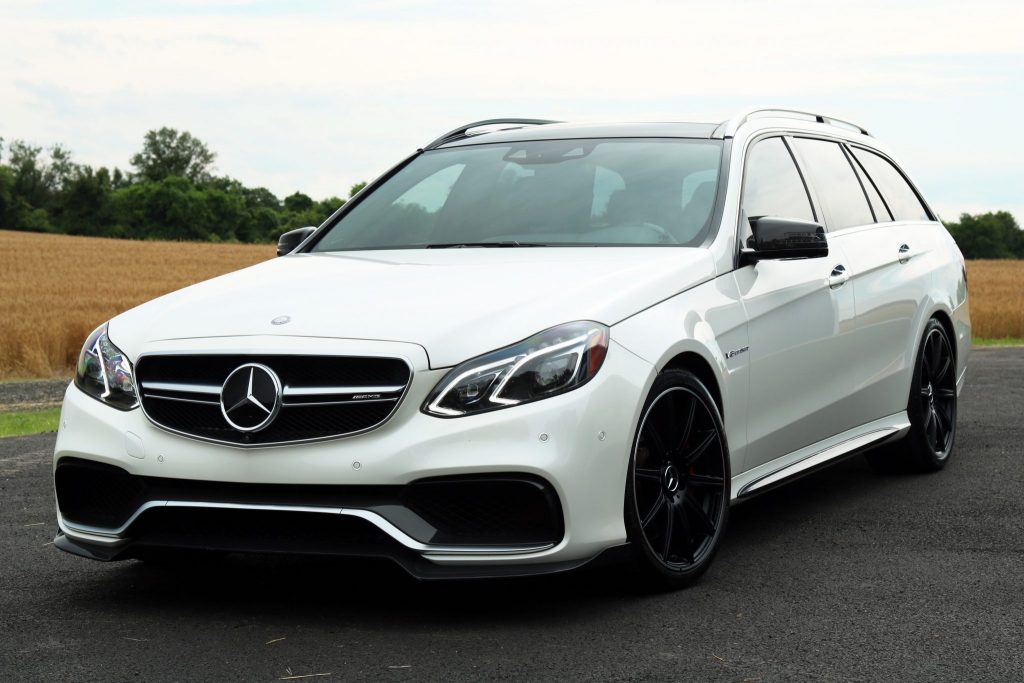 This 2015 Mercedes-AMG E63 S 4MATIC wagon is finished in Diamond White Metallic over black leather and powered by a twin-turbocharged 5.5-liter V8 paired with a seven-speed automatic transmission and 4MATIC all-wheel drive. Equipment includes an aftermarket carbon fiber front splitter, the AMG Exterior Carbon package, black-finished 19″ AMG wheels, dynamic LED headlights, a panoramic sunroof, heated and ventilated dynamic front seats, an aftermarket carbon fiber steering wheel, Keyless-GO, heated rear seats, the Driver Assistance and Parking Assist packages, COMAND infotainment with navigation, and a Bang & Olufsen sound system. The car was registered in California with its first owner until 2015, when it was repurchased by Mercedes-Benz under the lemon law buyback program because of suspension noise. It later spent time in Florida, Kentucky, and Indiana before being acquired by its current owner in September 2016. Subsequent work has included oil and brake fluid changes, replacement of the tires, and a steering rack bolt recall.